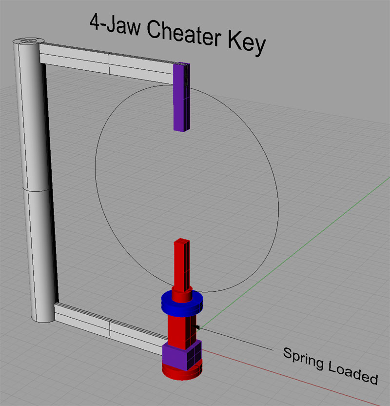 The circle is your 4-jaw chuck. The key consists of two keys so you can engage opposite sides at the same time by rocking the handle to move the part up or down as needed. The lower key is spring loaded just like the graver. To use the key, pull the spring load apart engage the fixed key, release the spring load to engage the floating key, and you're ready to go. The blue piece is just a shaft collar that holds the spring. The sliding portion is square tubing so the key is forced to turn. I'm thinking the handle assembly is welded together.