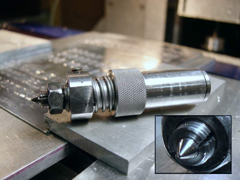 Evan over on the HSM boards has come up with a simple spring-loaded graver that is ideal for drag engraving. Using this method, the spindle doesn't move, rather the graver drags to cut the metal. While such a graver won't go deep, it leaves a nice effect: