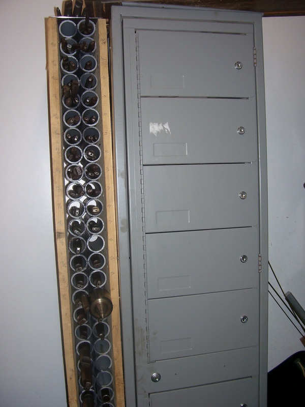 Similar to my small parts cubby cabinet, but made of welded tube and angle iron. Pretty slick and compact. The PVC tubes on the right are for oversized drill bits and such...