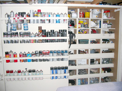 Many drawers are good. This bunch seems to be in an outdoor shed. On the right we see that doors can be used to hold cans o' stuff.