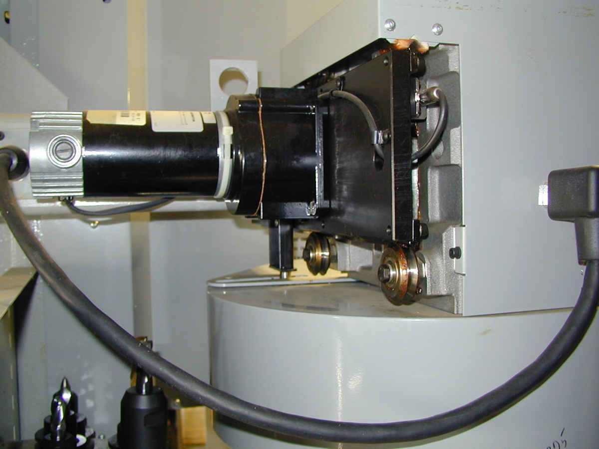 Third, how then to index? Again, it seems to me the easiest thing is to arrange a second motor to do the indexing. Seems to me servos are designed to run at the kinds of speeds these spindles turn at. Just bought a nice one from Homeshopcnc that'll do 4500 rpm, for example. So we make sure that we can run one motor or the other BUT NOT BOTH electrically. We freewheel the servo when the spindle motor is going, and freewheel the spindle motor during indexing. Why a servo? Well because we can put the encoder onto the machine's spindle (not the spindle motor!) and let it sense the true motion and soak up any backlash to increase accuracy. There won't be much anyway if we use a toothed belt drive. If you prefer, a decent sized stepper is cheaper still. You'll want to groove the toothed belt else when the spindle motor runs it'll scream like a banshee, but that's easy to do too. So, we need to add a toothed belt pulley to the existing spindle motor pulley stack and drive it with a suitably mounted servo or stepper.