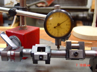 It's just a couple of aluminum blocks that clamp to the lathe. The calipers (I picked the ones whose feel I like the least. They were cheap from eBay!) are bolted to the bottom of the top block. The bottom block has a vertical bar to measure against. I found out the DRO is more accurate than the compound dial. Good to know!