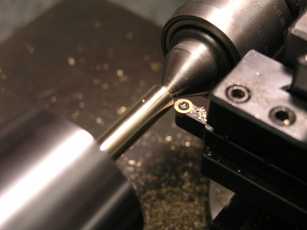 Turning with a parting blade makes it easy to get nice square shoulders if you need your smallest OD between two larger OD's. Here, we are about to plunge the blade and we'll be turning to the left shoulder that's visible. Don't try too much depth of cut. A sure sign of trouble is a build up of material on the part at the cutting point. Eventually something will break if that's happening--take a shallower cut! For this little brass part 0.010 to 0.015 on the dial (0.005 to 0.0075 actual DOC) worked well and gave a decent surface finish...