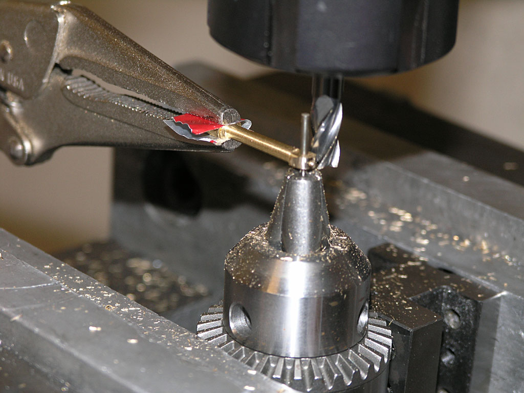 Place the small end on the pin of the fixture. I am using a 1/4" 4 flute end mill running at my mill's fastest speed...