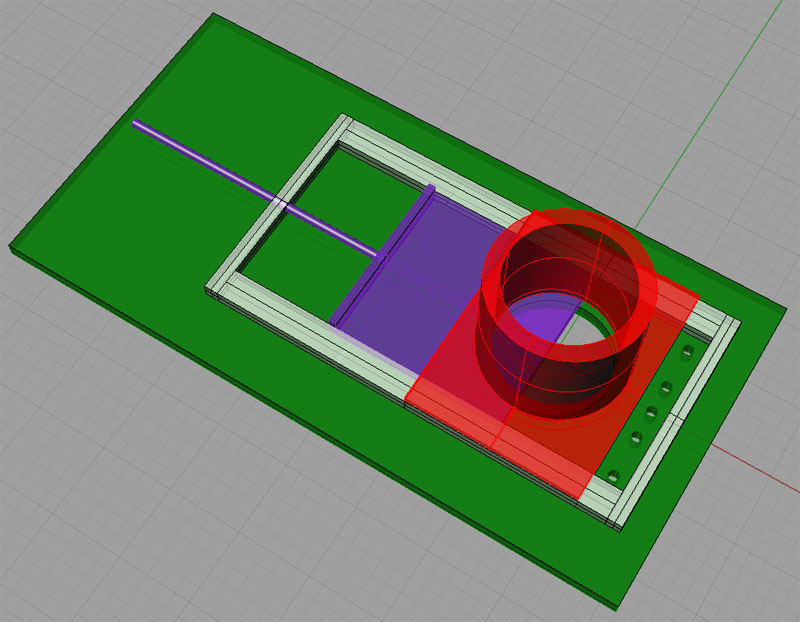 In the drawing above, red is the compression chamber, ram enters from above. Purple is a gate at the bottom that opens so the puck can drop through. The series of holes in the green base plate allows coolant to run out a separate path for recycling.