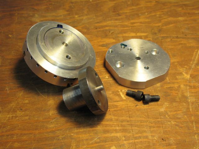 Hub holes threaded, plate for disc drilled and countersunk, and some progress mounting a 4-jaw lathe chuck to my rotary table: