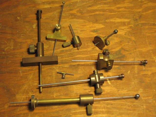 Front row shows the Micro100 CCMT tooling with 1/2" shanks. Then there's my nifty center height setting tool. I got it from Brownell's and it works really well! In front of that is an indicator holder I sometimes put into a QCTP holder so I can use an indicator on the lathe. And lastly, we have my knurlers. The scissor-type I got for $29.95 from Lathemaster. Haven't had a chance to try it because it won't fit in my QCTP's. I need to modify a QCTP on the mill to hold the big shank. The other is the standard knurler that comes with the QCTP set I got.