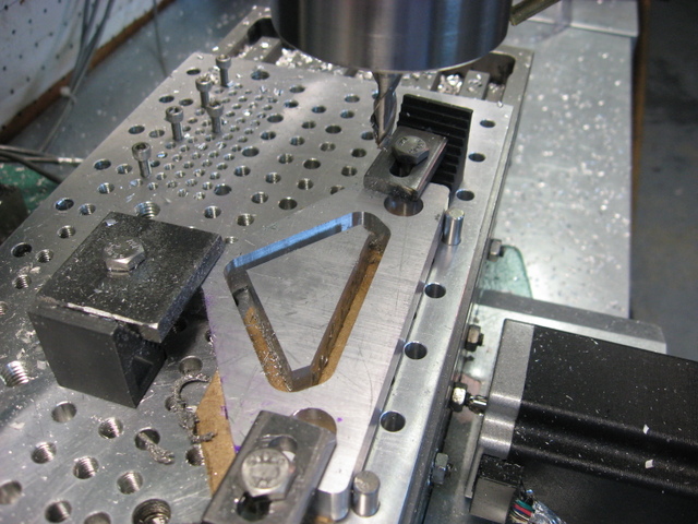 Got some cut. Now he can flip the plate around 180 degrees and cut the rest. Note that this rig is keeping the cutting from getting far off the edge of the table or the axis. Keeping the cutting over the center of mass of the mill means better rigidity!