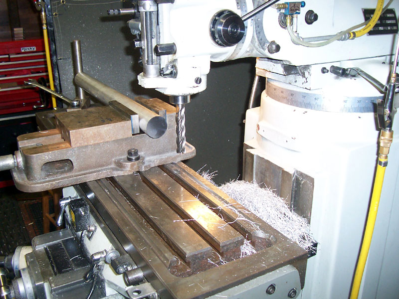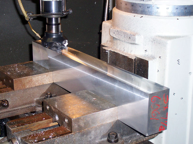 Now we're cutting T-slots. First use a regular end mill to slot. Coolant mister is firing at the trailing edge to clear chips...