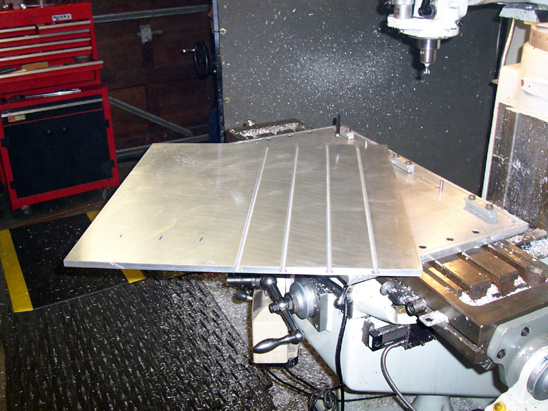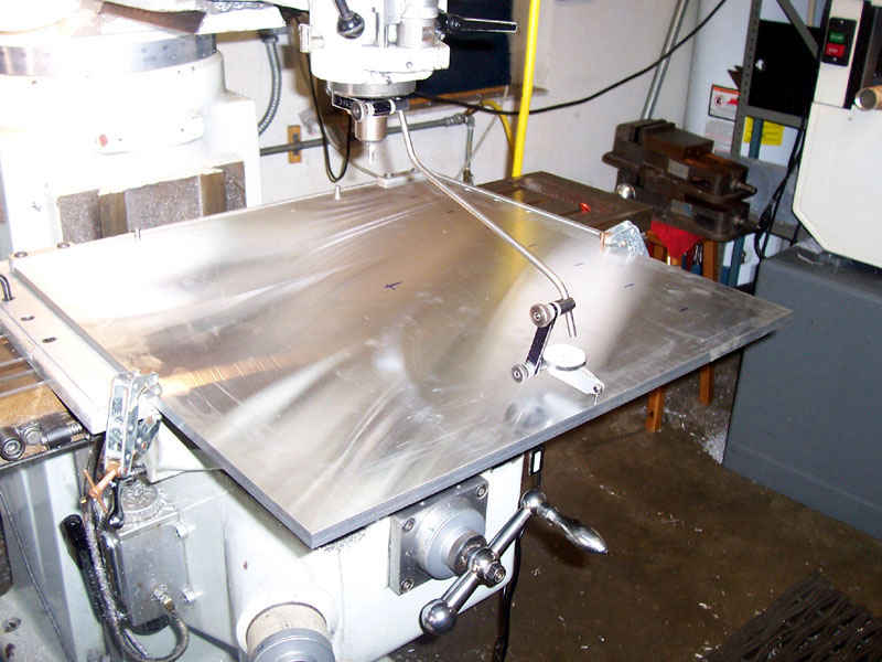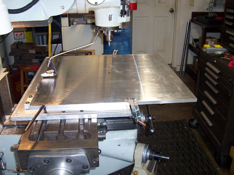 First job is to square the 24" x 24" MIC-6 plate that will serve as the table. Dang that's a big ole plate on that mill! In fact it is 2 plates stacked and clamped together. Note the use of soft material to protect the finish on the MIC-6 plate as wel as additional clamps, and the dial indicator to get the edge aligned with the axis...