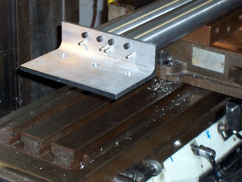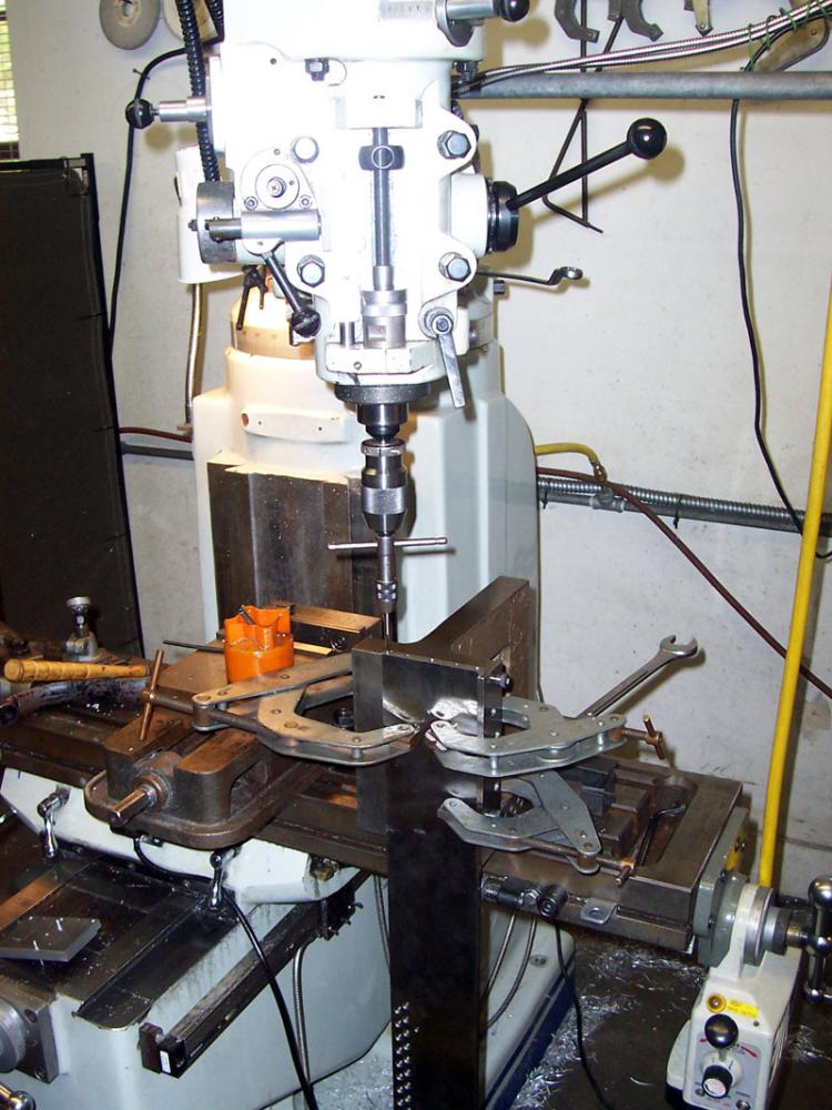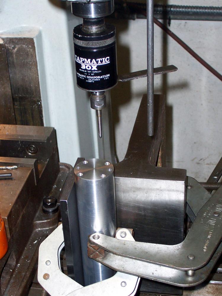 Widgit is drilling and tapping the end of the long piece. There's also 2 drilled and reamed holes for precision dowel pins. Bolts are not for alignment, they're for clamping. The dowel pins ensure precision alignment. Note the tap holder--essential for getting things straight up and down! I'm slightly surprised he isn't power tapping it, but maybe this is more precise and it's certainly less likely to break a tap in the steel fixture. Note the copious use of Kant-Twist clamps. Those things are a God-send!