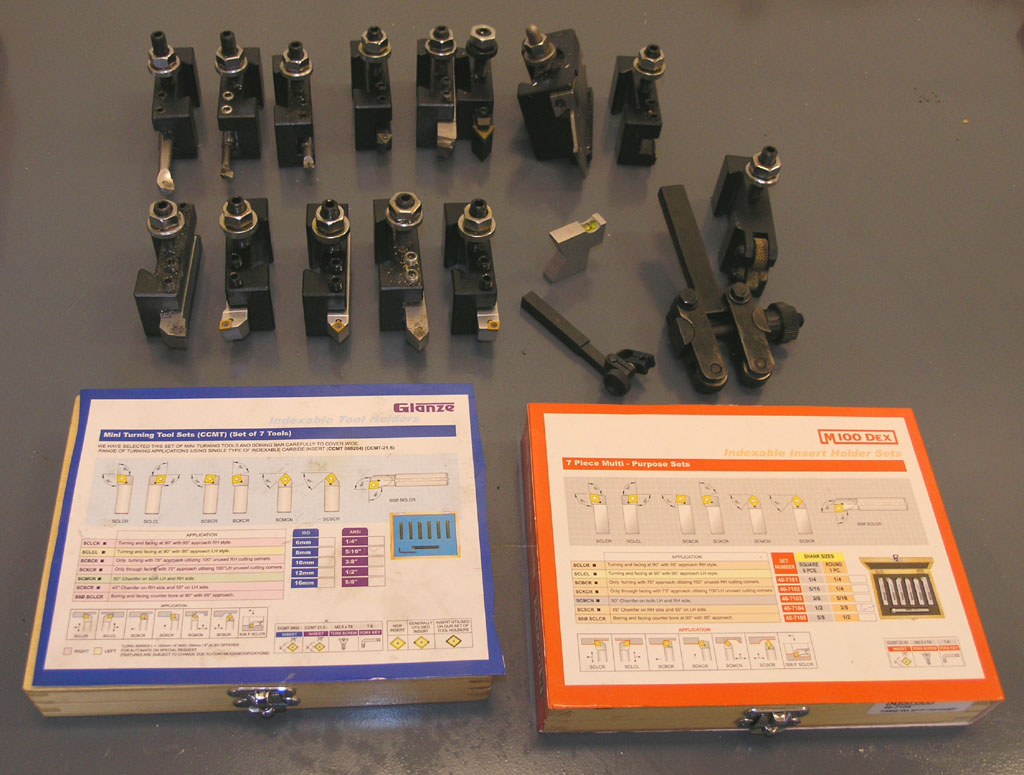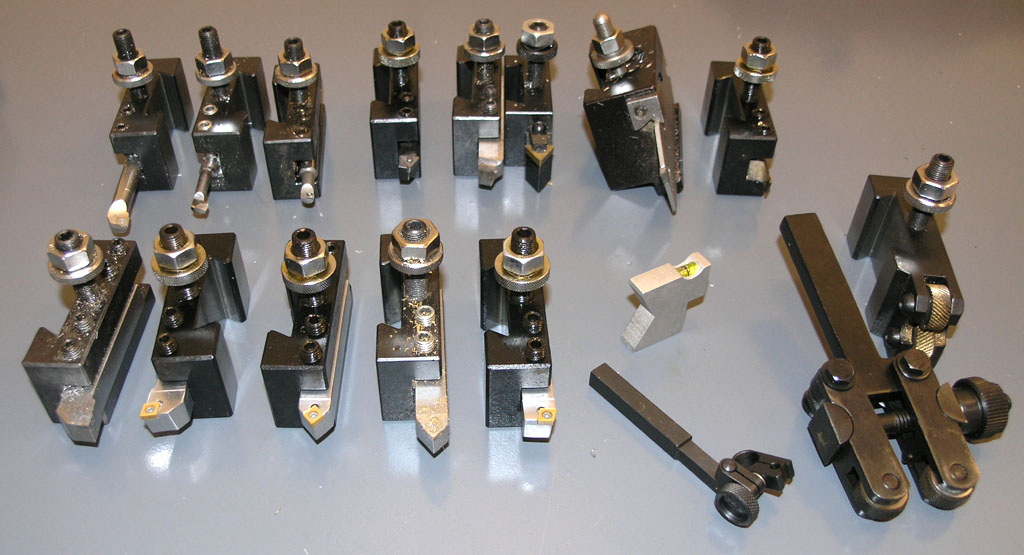 I got 5 new QCTP holders in that I ordered from CDCO. They were $10 apiece, so they were irresistable. I went ahead and stuck some tools in them so they'd be ready to go, and decided I would photograph my collection of lathe cutters for my QCTP: