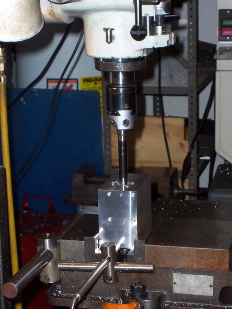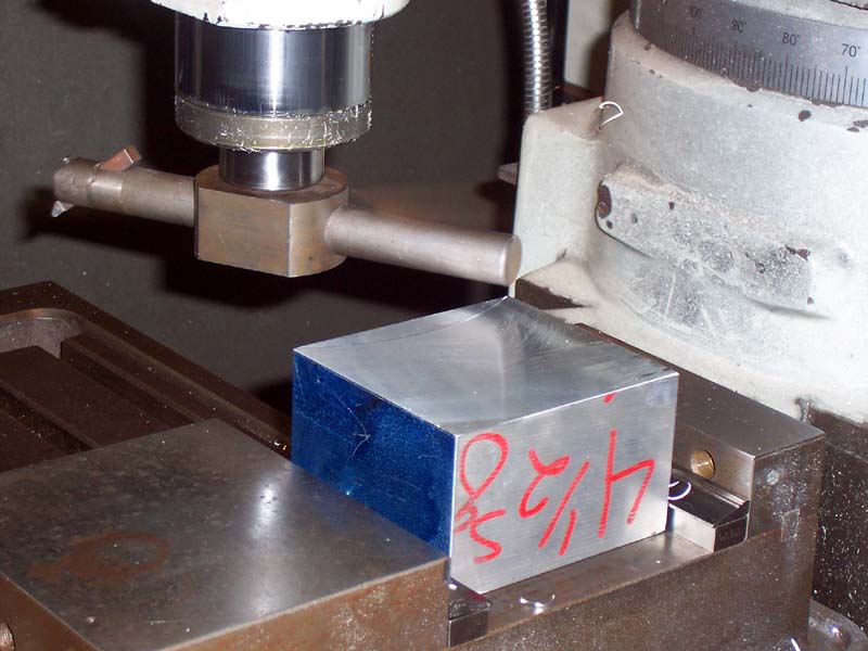 Two things to note while squaring this block. First, check out the Starrett vise hold downs on either side of the block in the vise. Need to get a set of those myself! Second, check out the great big fly cutter he is using...