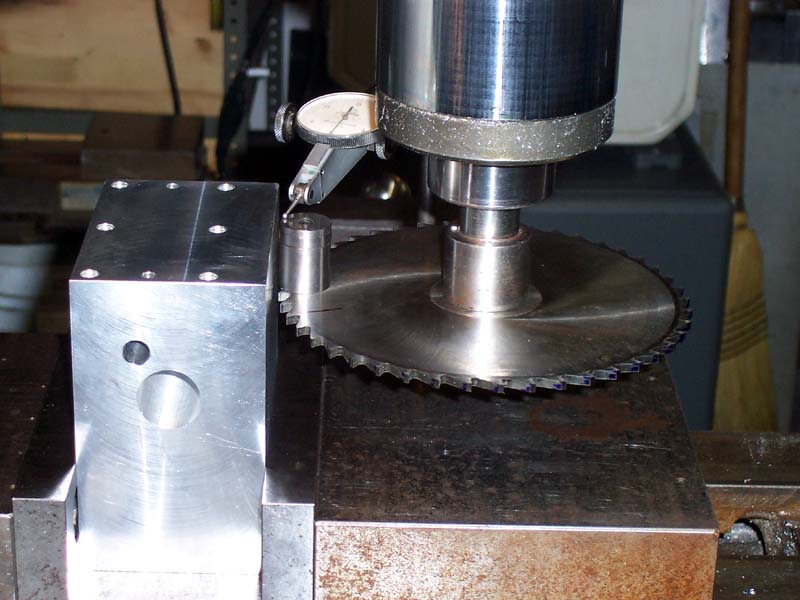 Indicating the slitting saw in with some space blocks so the middle of the saw cut is just where it needs to be relative to the top of workpiece. Widget suggests plunging the saw straight in rather than starting from the side when cutting because the hole will keep the saw centered instead of pulling it off axis...