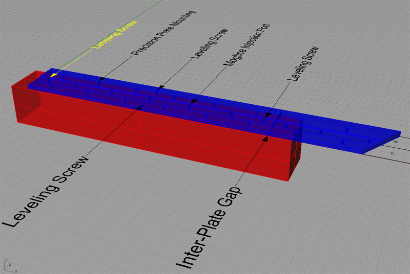 The precision plate (blue) sits atop the structural frame (red). Linear rail mounting holes not shown for clarity.