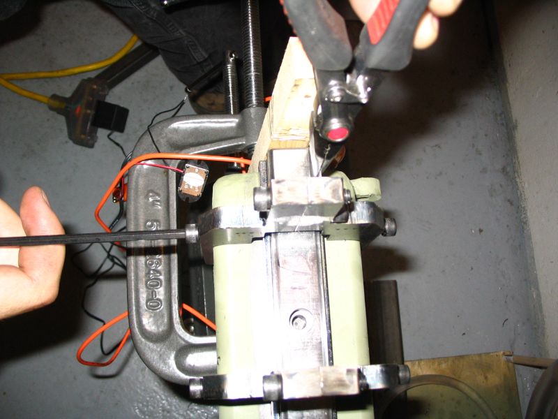 Pliers are holding the continuity test wire while the allen head is used to tweak the rail left or right. Once it is in the correct position, Jerry then drills a mounting hole. He has started off with drill bushings to create pilot holes.
